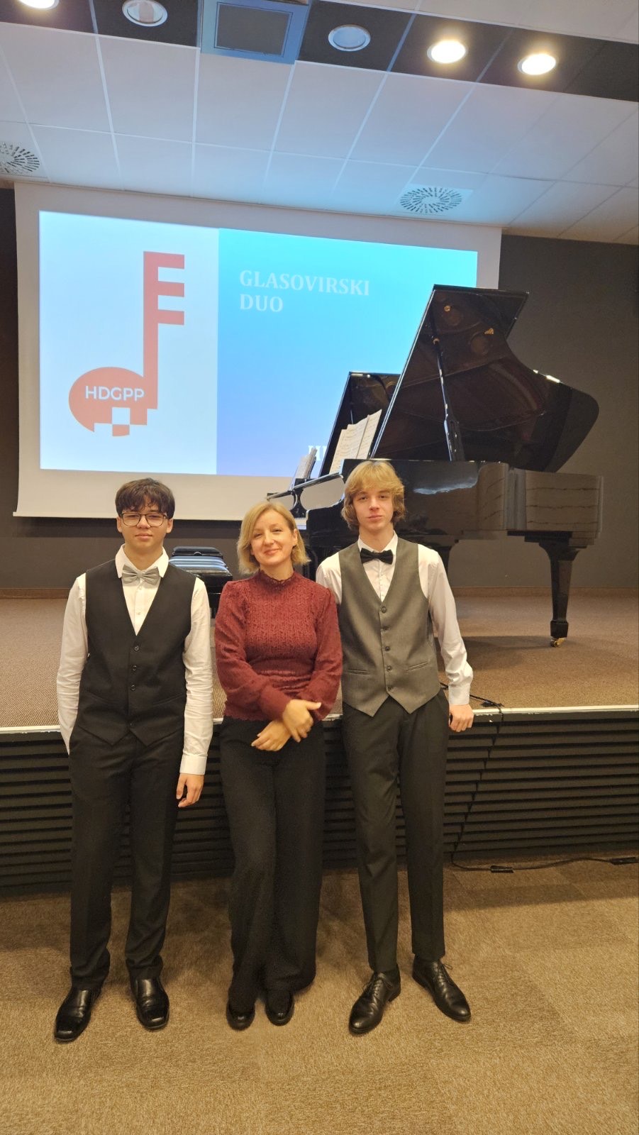 Izvanredne vijesti stižu nam iz Lovrana! Na 64. hrvatskom natjecanju učenika i studenata glazbe-komorni sastavi, danas su nastupila dva naša klavirska dua. Prvu nagradu s 92,20 bodova i prolaz na državno natjecanje osvojili su Jan Stilinović i Ivan Horvat u 3. kategoriji uz mentoricu Mirjanu Dizdarević Bjelajac. Učenice Vanesa Duvnjak i Tamara Kulej na istom su natjecanju u 1. kategoriji osvojile odličnu drugu nagradu s 85.40 bodova. Njihova mentorica je Tihana Sarošević.