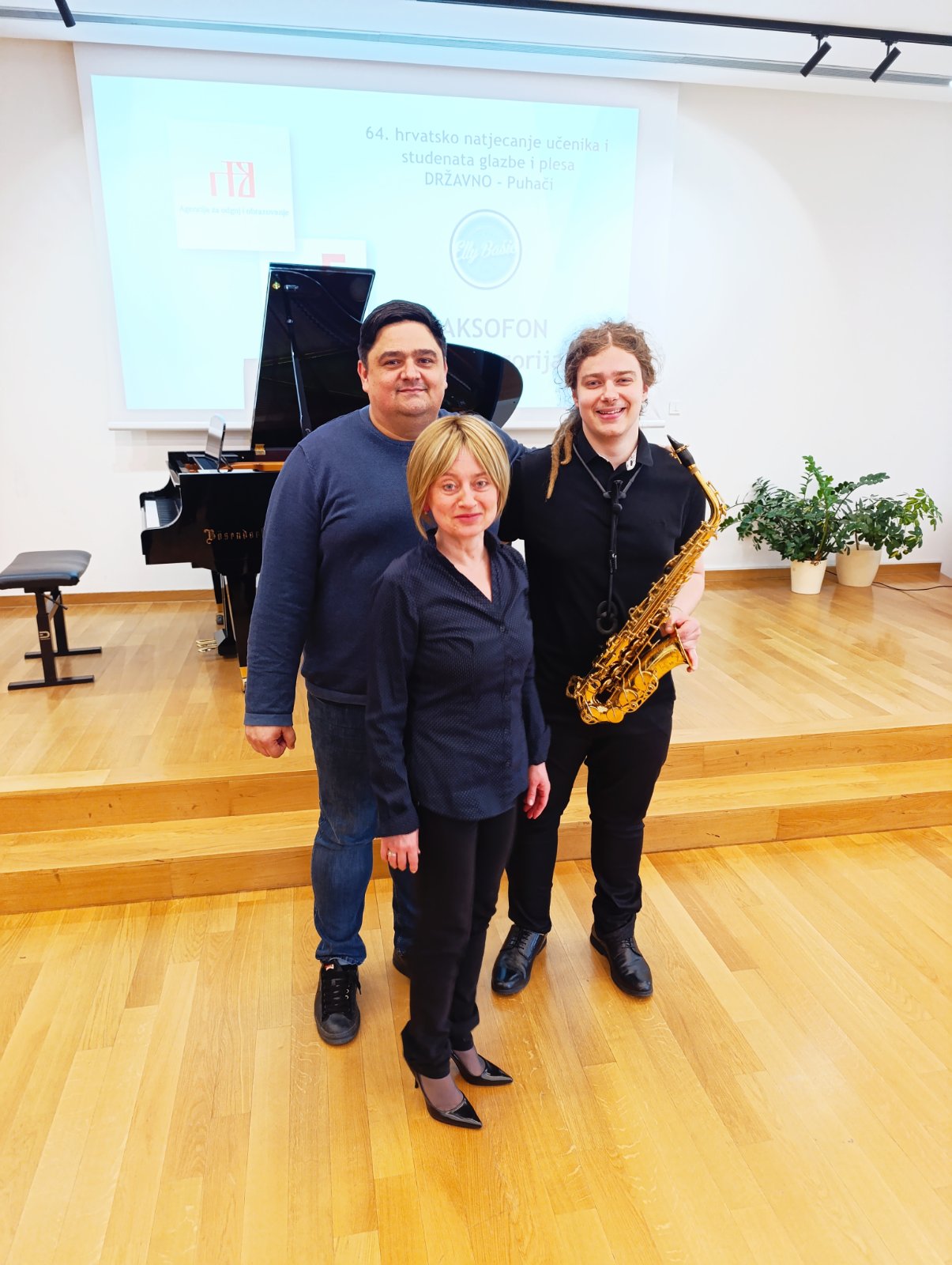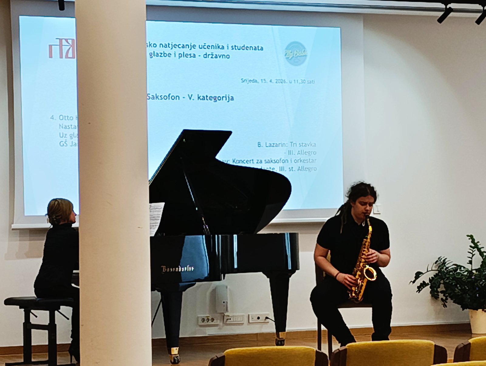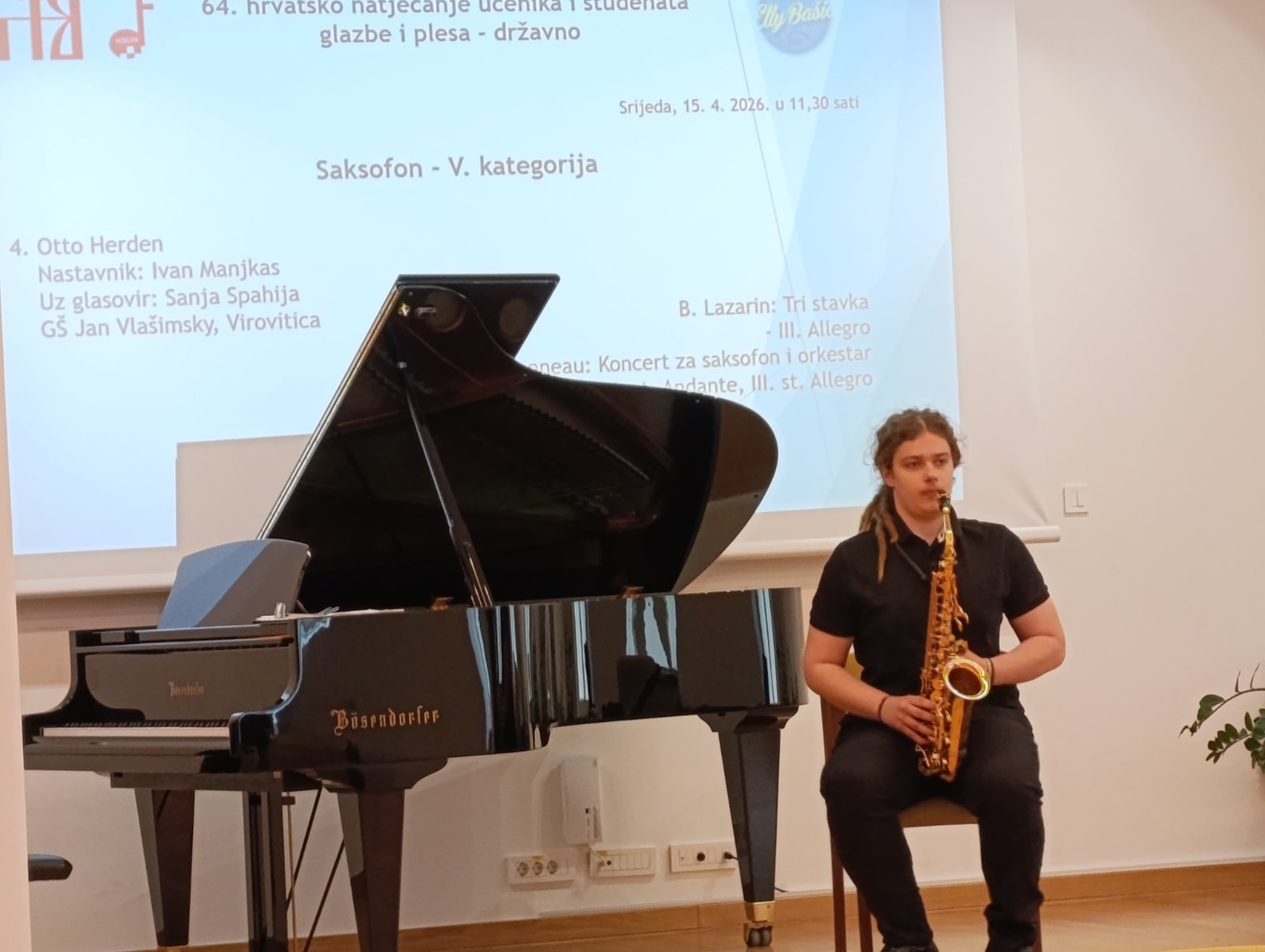 Lijepa vijest stigla nam je sa 64. hrvatskog državnog natjecanja učenika i studenata glazbe i plesa. Učenik naše škole, Otto Herden natjecao se u V. kategoriji u disciplini saksofon i osvojio II. nagradu – 96,00 bodova. Mentor je Ivan Manjkas, mag.art., a korepetitorica Sanja Spahija, mag.art. Čestitamo svima na izvrsnom rezultatu!